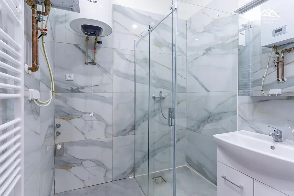 Vytápění je v bytě řešeno vlastním elektrickým kotlem, ohřev vody zajišťuje bojler.