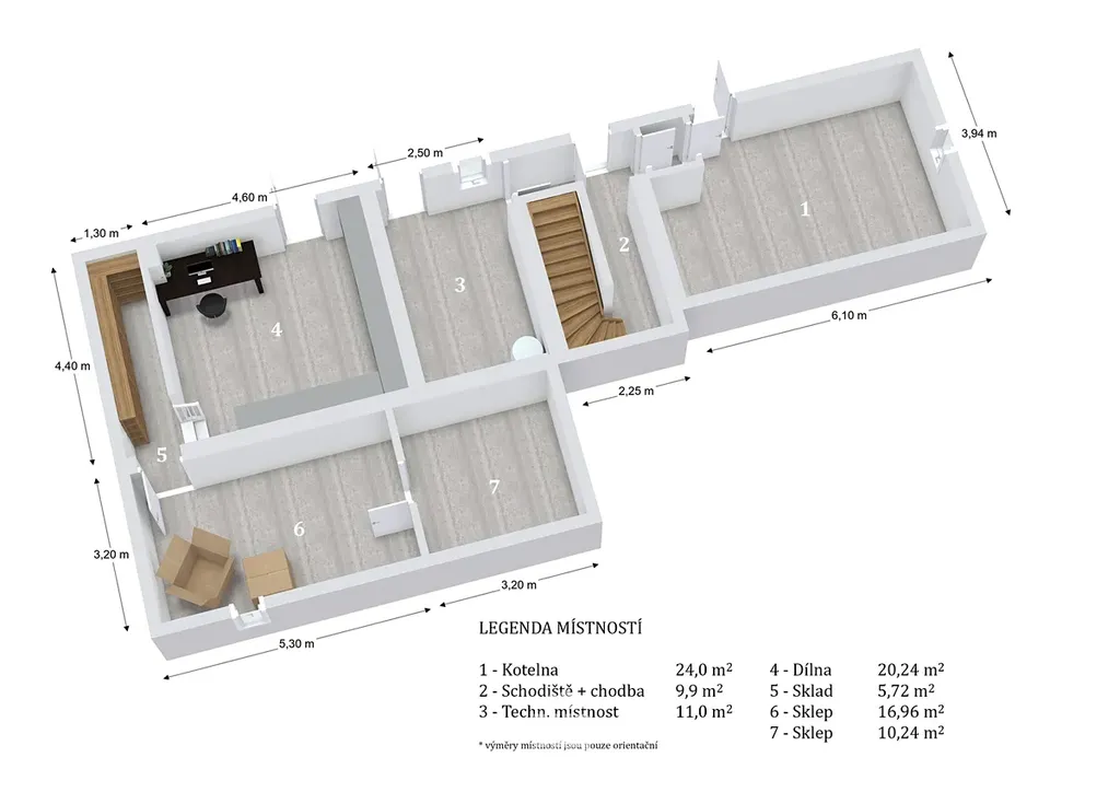 Výměry jednotlivých místností v 1.PP: kotelna - 24 m², schodiště + chodba - 9,9 m², technická místnost - 11 m², dílna - 20,24 m², sklad - 5,72 m², slep - 16,96 m², sklep - 10,24 m².