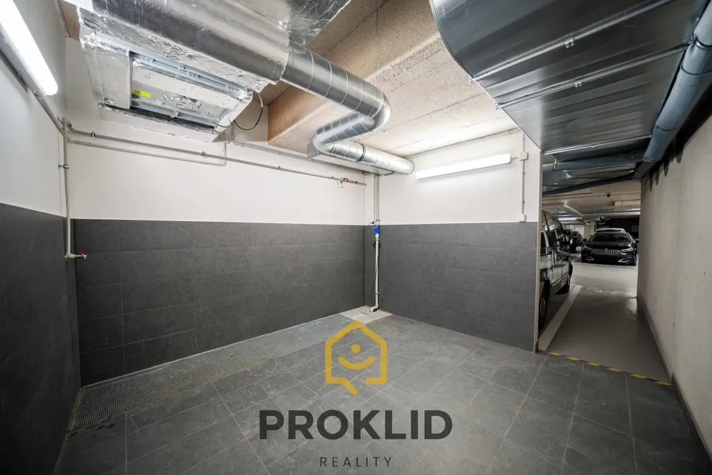 K bytu je podmínkou navíc přikoupit 2× garážové stání s vlastními el. zásuvkami a přípravou pro elektromobil na sloupu vedle stání. Dále 1× sklep, který zaujme svým nadstandardním prostorem (16,97 m²) a tím řeší kompletní problémy kolem úložných prostor majitelů bytů. V garážích je velice praktická umývací mistnost např. pro kola, kočárky atd.