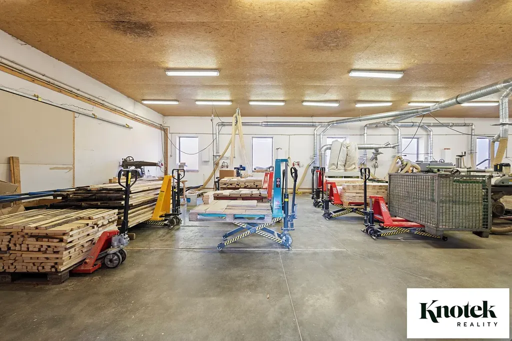 Výměry: garáž 40,76 m2, sklad 1: 19,28 m2, sklad 2: 22,22 m2, klimatizovaný sklad 3: 12,13 m2, sušárna dřeva 37,69 m2, venkovní polootevřený sklad 99,85 m2.