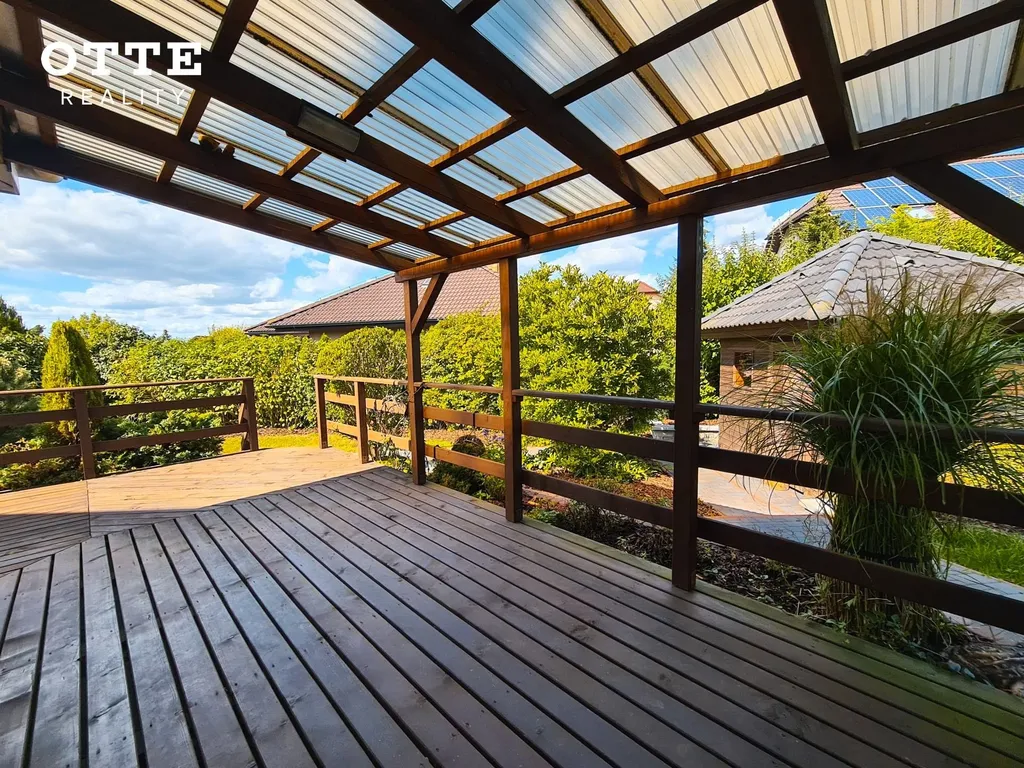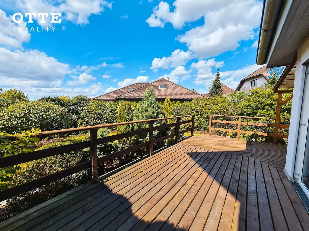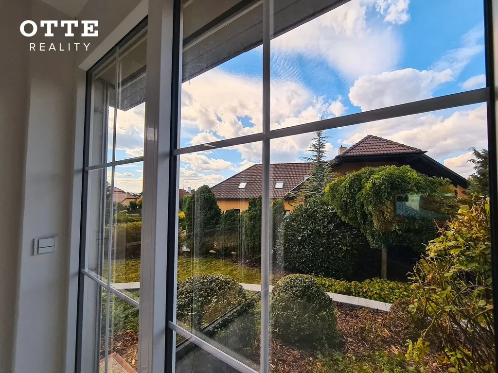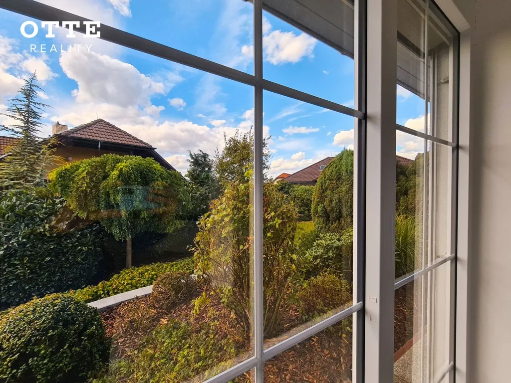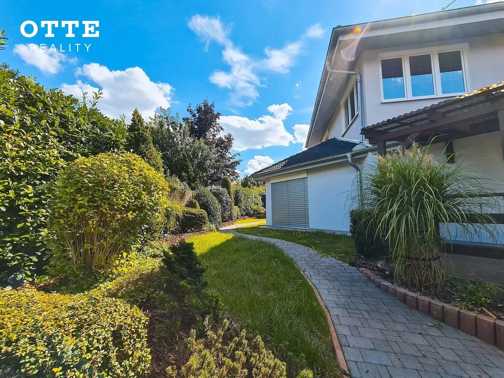 Zahrada je udržovaná se vzrostlou zelení s prostornou, zastřešenou, dřevěnou terasou u domu. V zadní části zahrady je zahradní domek. Celková výměra pozemku je 780 m2. Vjezd na pozemek zajišťují elektricky ovládaná vrata na dálkové ovládání. K parkování je možné používat zastřešené parkovací stání pro dva automobily, před tímto carpointem jsou další parkovací možnosti.