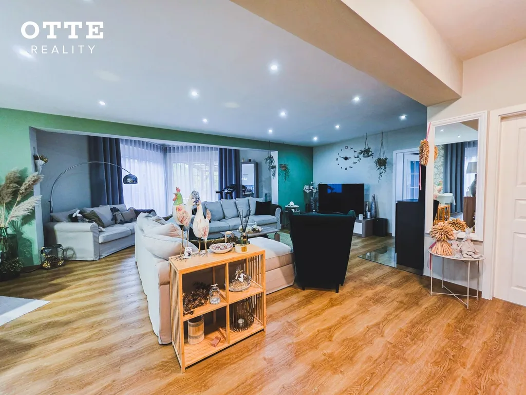 V přízemí domu je vstupní předsíň, chodba se šatní skříní, u které je WC se sprchovým koutem a umyvadlem. Z chodby se vejde do prostorného obývacího pokoje s jídelní a kuchyňskou částí s nově nainstalovanou kuchyňskou linkou včetně vestavěných spotřebičů jako je indukční varná deska, elektrická varná trouba, digestoř, lednice, mikrovlnná trouba nebo např. systém tříděného odpadu. Na obývací prostor navazuje prostor používaný jako zimní zahrada se vstupem na venkovní zastřešenou terasu o velikosti cca 25 m2. Dále je v přízemí domu pracovna s krásným pohledem do zahrady a technická místnost kde je umístěn elektrický bojler, který zajišťuje ohřev teplé vody. Podlahu kryje vinyl a dlažba. V obývacím pokoji jsou krbová kamna a vestavěná skříň.
