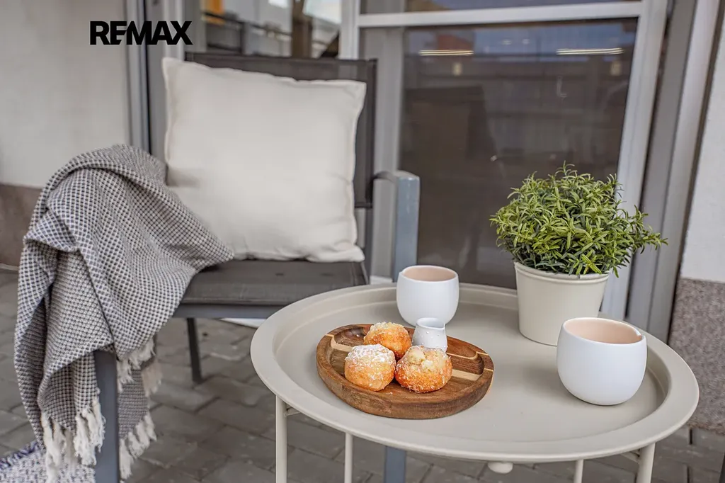 Byt nabízí moderní kuchyňskou linku s vestavěnými spotřebiči, otevřený obývací prostor s jídelním koutem a přímým vstupem na zahradu.