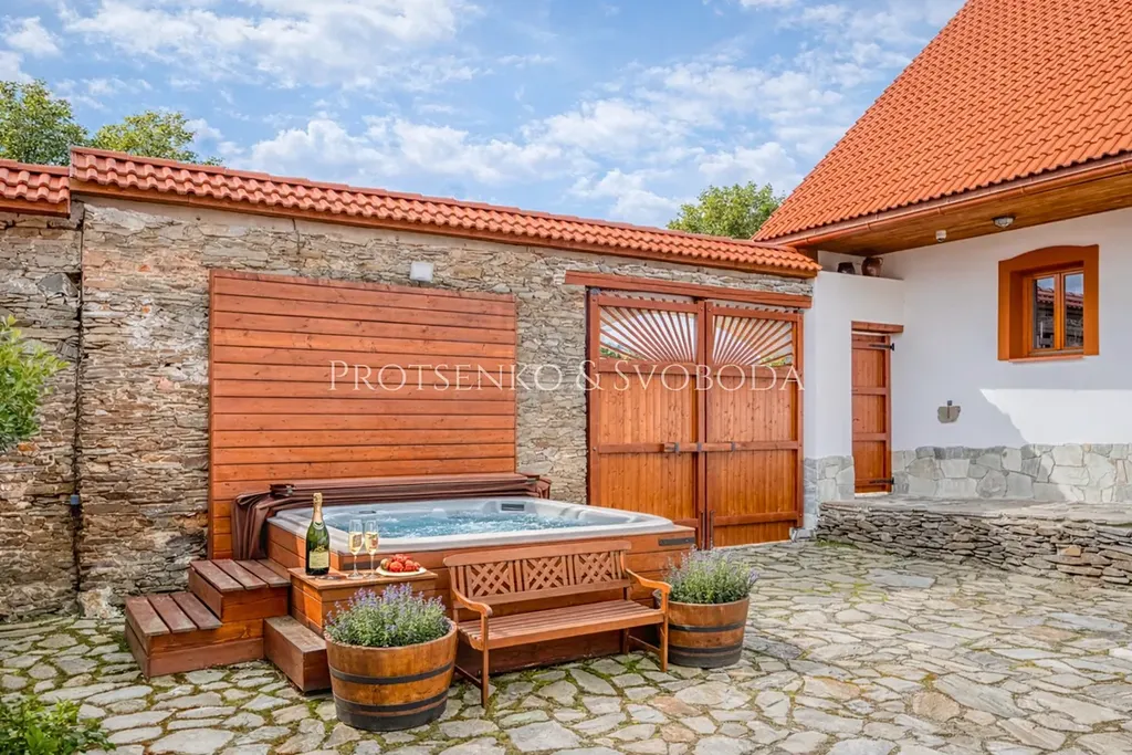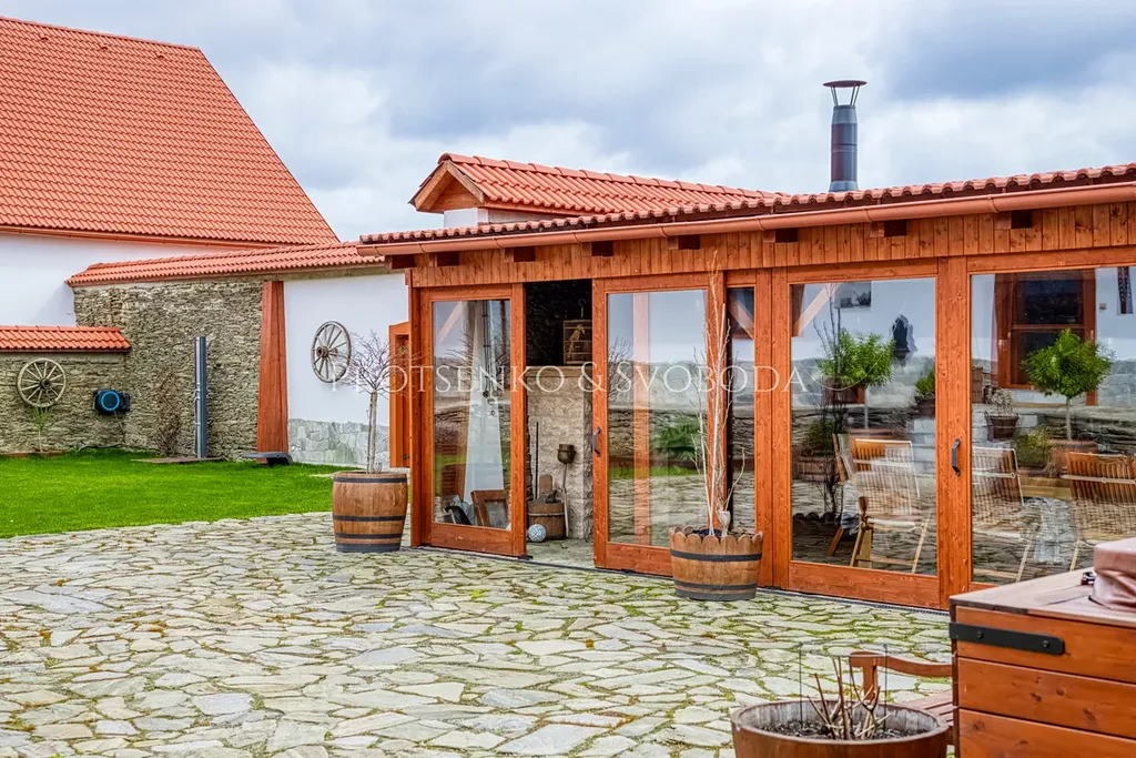 Atmosféru místa dotváří uzavřený dvůr, krásně upravené venkovní plochy, kamenné prvky, dřevo, velkorysá zahradní kuchyně, relaxační zóna i pečlivě vysazená zahrada s ovocnými stromy. Celý areál působí harmonicky, bezpečně a mimořádně reprezentativně. Je to místo, kde si umíte představit klidné rodinné ráno, letní večer s přáteli, firemní setkání i víkendový pobyt hostů, kteří sem přijedou za odpočinkem a zážitkem.