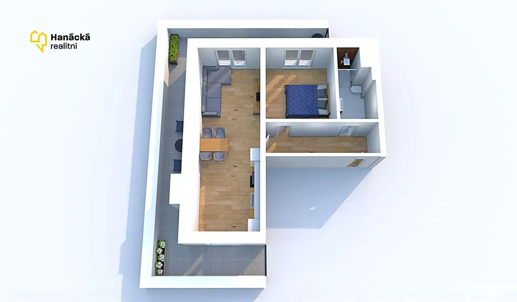 Byt o dispozici 2+kk a výměře 54 m2 disponuje velkorysým obývacím pokojem a špičkovou kuchyní. Unikátním prvkem je terasa o výměře 32 m², která lemuje celý byt. Díky vstupům z obou pokojů propojuje interiér s exteriérem a nabízí maximální soukromí v posledním (5.) patře.