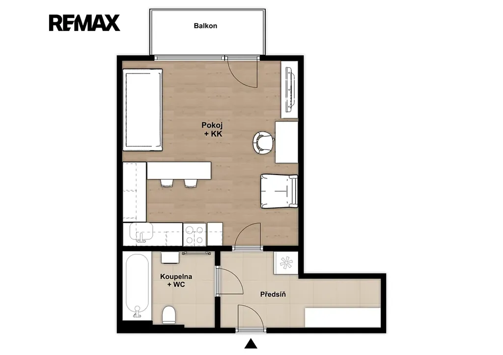 Prostor je prakticky řešen: vstupní chodba s prostornou vestavěnou skříní, koupelna s vanou a WC a hlavní obytná místnost s velkorysou kuchyňskou linkou vybavenou vestavěnými spotřebiči (elektrická trouba, sklokeramická varná deska, myčka nádobí). Díky velkému francouzskému oknu je obytná část světlá a slunná. Součástí bytu je také balkón, ideální pro ranní kávu, krátký odpočinek po práci nebo klidné posezení. Vytápění a ohřev vody jsou zajištěny ústředním plynovým vytápěním. Dům je moderní a dobře udržovaný a splňuje energetickou třídu PENB B, což znamená velmi úsporný provoz.