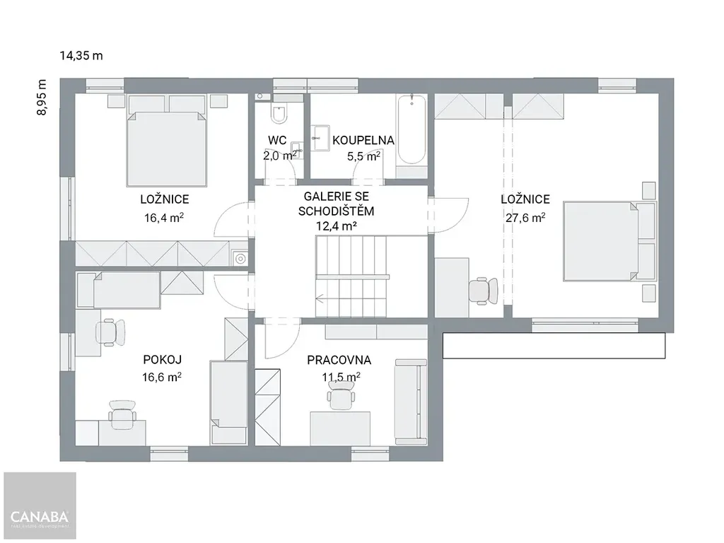 V přízemí domu naleznete vstupní halu, velkorysý prosluněný obývací pokoj 33 m² s výstupem na zahradu, kuchyň 11,2 m², toaletu, technickou místnost, komoru a nesmí chybět ani šatna. V patře je k dispozici ložnice. Z haly dále vstupujete do 2 dalších pokojů, pracovny, velké koupelny s vanou a sprchovým koutem. Toaleta je zvlášť.