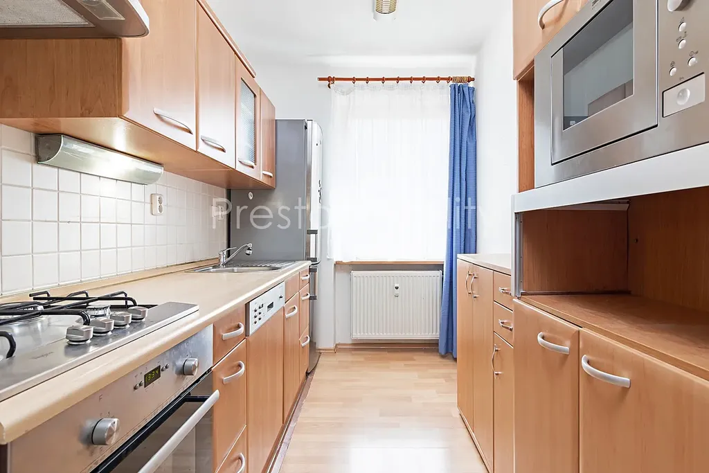 Byt se skládá ze tří neprůchozích pokojů: nevybavený velký obývací pokoj (21 m2), ložnice, která má po celé délce šatní skříně plus přístup na balkón (13 m2) a pak nevybavený malý pokoj vhodný jako dětský pokoj nebo pracovna (10 m2). Kuchyň je kompletně vybavena (kuchyňská linka obsahuje sporák s troubou, myčku, mikrovlnku, lednici s mrazákem). Koupelna s vanou, WC zvlášť. Topení zajištěno ústředním vytápěním (plynový kotel v domě). Ohřev vody bude zajištěn novým elektrickým bojlerem, který bude během 3 týdnů nainstalován místo dosavadního plynového kotle umístěného v koupelně. K dispozici velký sklep s policemi o ploše 9 m2.