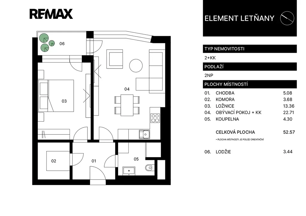 Nabízíme k prodeji útulný, světlý a zcela připravený byt 2+kk o velikosti 52,57 m² s lodžií 3,44 m², umístěný v 2NP moderního rezidenčního projektu Element Letňany, který byl dokončen v roce 2019 renomovaným developerem Geosan Development.