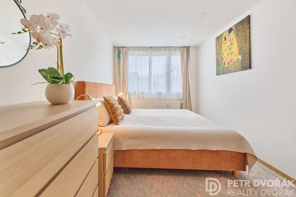 Byt prošel v roce 2024 kompletní rekonstrukcí odbornou firmou — nové rozvody elektřiny a vody, radiátory, podlahy včetně podkladů, kuchyňská linka i spotřebiče. Trojskla jsou vybavena elektricky ovládanými roletami na dálkové ovládání. Akusticky upravené stěny a stropy zajišťují skutečný klid v každé části bytu. Interiér dokreslují dveře z dubové dýhy sladěné s podlahou.