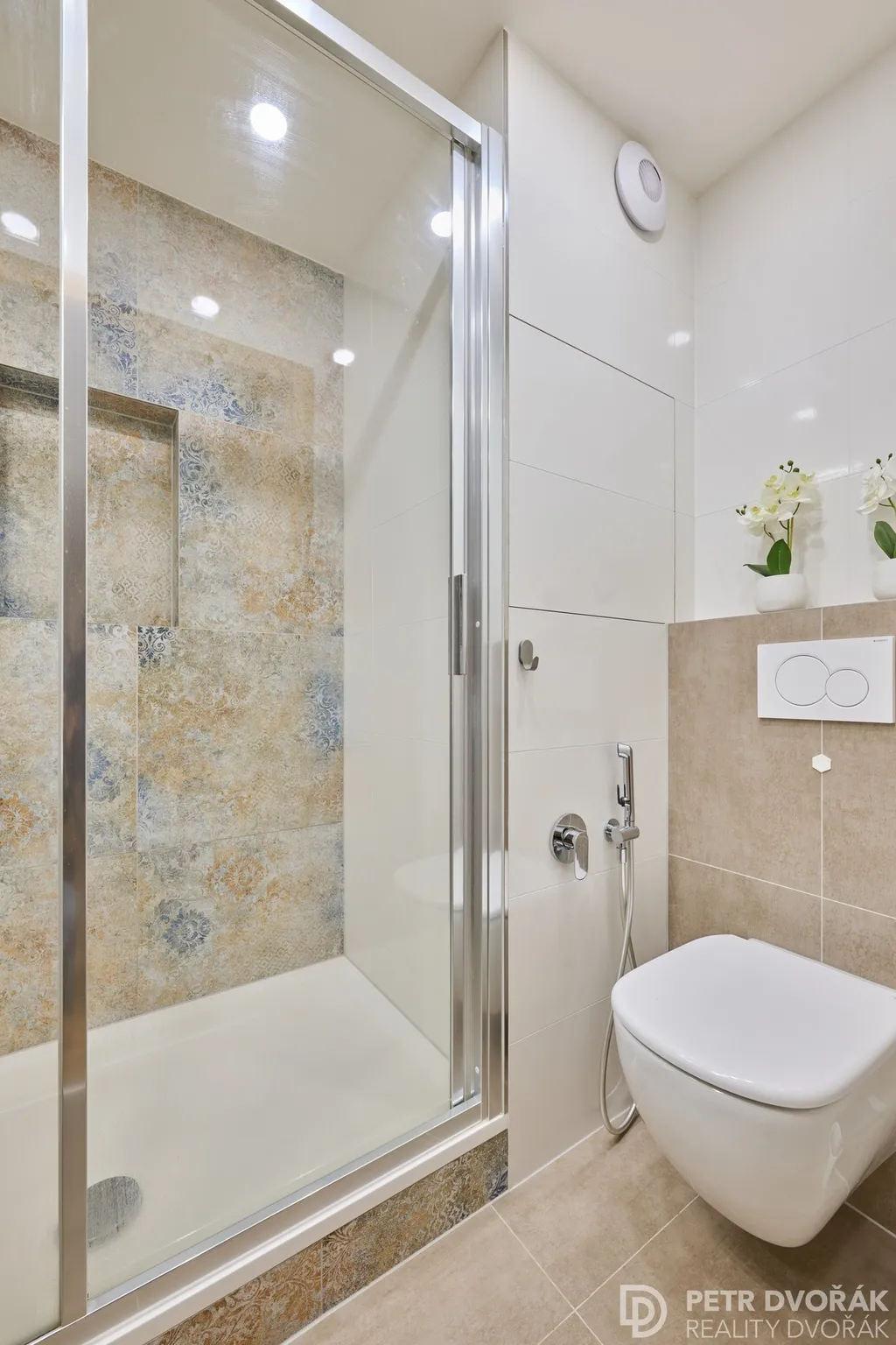 Jihovýchodní část — obývací pokoj s kuchyní a hlavní ložnicí — tvoří světlý celek s výhledem na zeleň. Severozápadní křídlo nabízí klidné prostředí ideální pro práci, dětské pokoje nebo odpočinek. Obě části propojuje prostorná hala. Byt má dvě koupelny, dvě samostatné toalety, bidet a bidetové sprchy — komfort, který se v této kategorii hledá jen výjimečně.