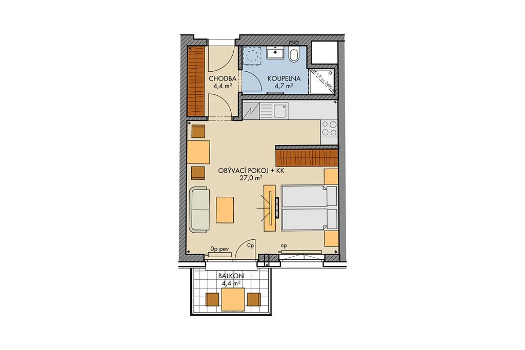Nabízíme nový byt 1+kk o podlahové ploše 37,60 m² s balkónem (4,40 m²) ve zcela novém projektu Nový Opatov developerské skupiny FINEP.