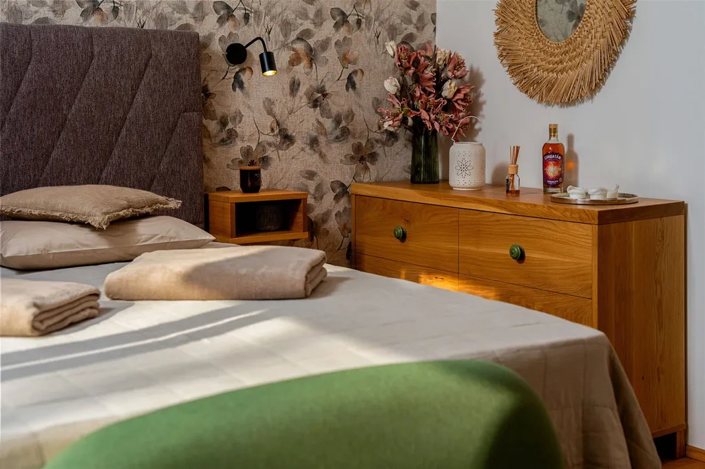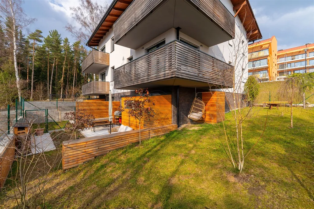 Dispozičně je apartmán řešen s důrazem na funkčnost, dostatek světla a přímé propojení interiéru s exteriérem prostřednictvím terasy a velké zahrady. Ze zádveří a chodby s šatnou navazuje koupelna s WC. Dále prostor přechází do hlavní obytné části spojené s kuchyní, ze které je vstup na prostornou terasu a zahradu. Zde naleznete ideální zázemí pro relaxaci: zahradní nábytek, vlastní saunu, venkovní sprchu a okrasné záhony. Zahrada nabízí výhled na hladinu jezera a nachází se ve velmi klidné části obce, přesto v pohodlné docházkové vzdálenosti na pláž i do samotného centra Lipna.