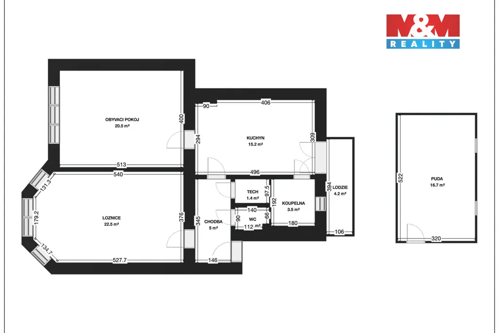 Byt je v původním, ale udržovaném stavu s plastovými okny, samostatným WC a praktickou dispozicí - samostatná velká ložnice se zaoblenou čelní stěnou, obývací pokoj a samostatná kuchyně s výškou stropů 295 cm. Je zde tedy možné vybudovat i další spací patro. Velkou přidanou hodnotou je půdní prostor o velikosti 16 m², který lze využít jako sklad nebo pracovnu.