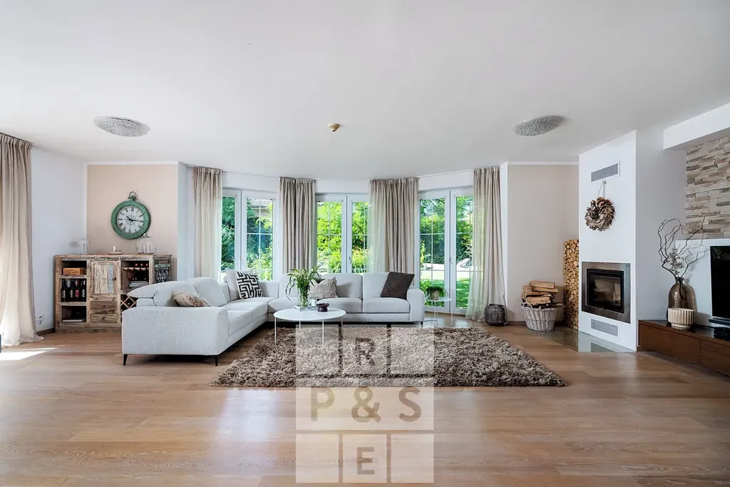 Dominantou domu je téměř 50m² velký, prosvětlený obývací pokoj s francouzskými okny, krbem a vstupem na velkou terasu. Kuchyňská linka s kamennou pracovní deskou, plně vybavená spotřebiči, navazuje na komfortní jídelní kout. Nechybí tři koupelny, velkorysá šatna, domácí kino ani pokoje s balkonem. V domě jsou dřevěné podlahy a schodiště, podlahové vytápění doplněné krbem zajišťuje tepelný komfort po celý rok. Vytápění zajišťuje plynový kotel, elektroinstalace 230 V a 3 fáze s jističem 25 A.