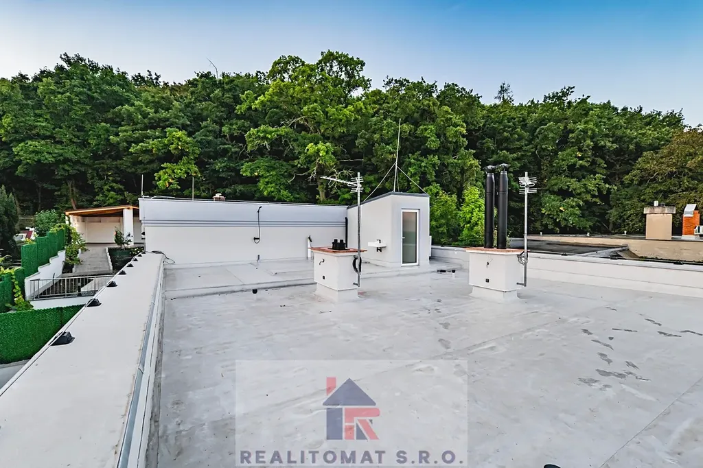 Na střeše rezidence jsou připravené terasy pro instalaci vířivek a saun. V zadní části domu je zastřešená pergola s přípravou na kuchyňskou linku.