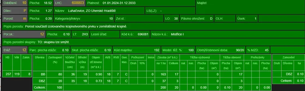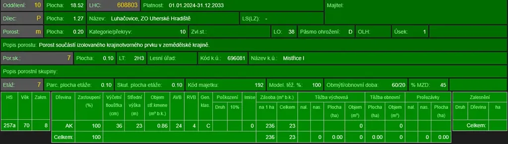 - p.č. 871/4 vedená jako lesní pozemek o celkové výměře 1 951 m2 (stáří lesa 121 let - zastoupení dřevin javor babyka, dub, stáří lesa 72 let - zastoupení dřevin akát).