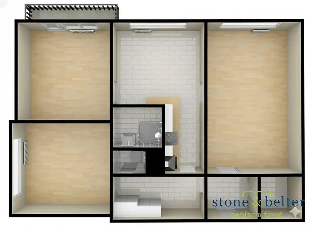 Dispozice zahrnuje tři samostatné NEPRŮCHOZÍ pokoje, kuchyň s jídelním koutem, prostornou chodbu s vestavnými skříněmi, koupelnu s vanou a samostatné WC.