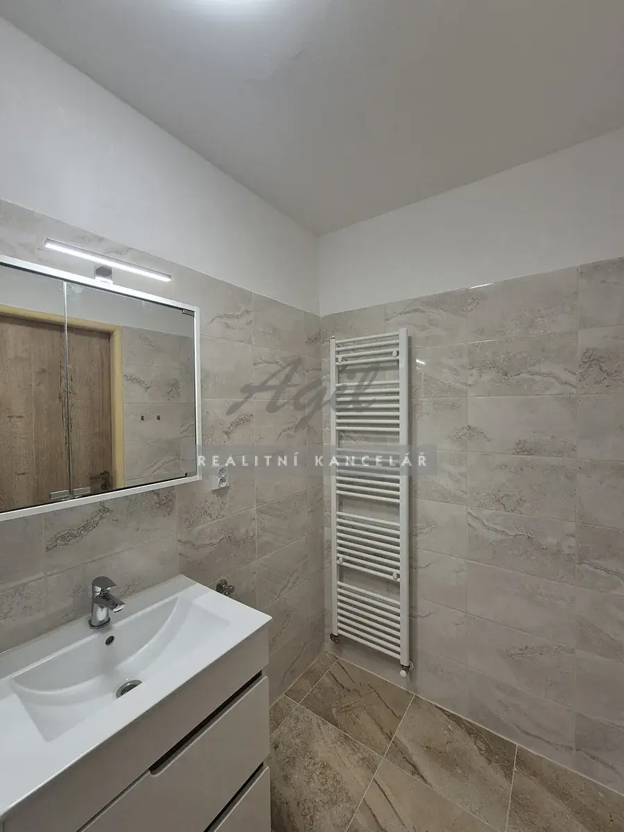 Koupelna – umyvadlo se spodní skříňkou, nástěnná zrcadlová skříňka s osvětlením, sprchový kout se skleněnou zástěnou, přípojka na pračku, otopný žebřík.