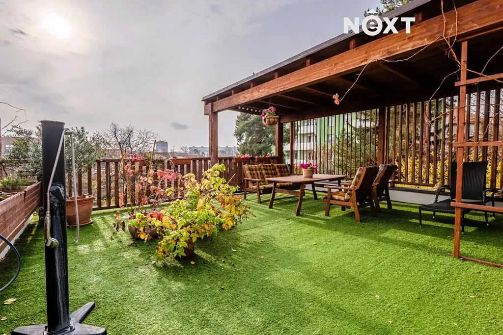 Součástí nabídky je nejen samotný byt, ale i navazující nebytové prostory, které dohromady poskytují komfort srovnatelný s rodinným domem. K dispozici je prostorná terasa (51,67 m²) s posezením, truhlíky na pěstování a venkovní sprchou, dále velkorysý ateliér (49,9 m²) s pracovním koutem a menší dílna (13,2 m²).