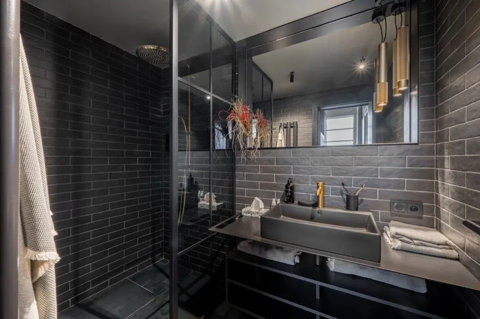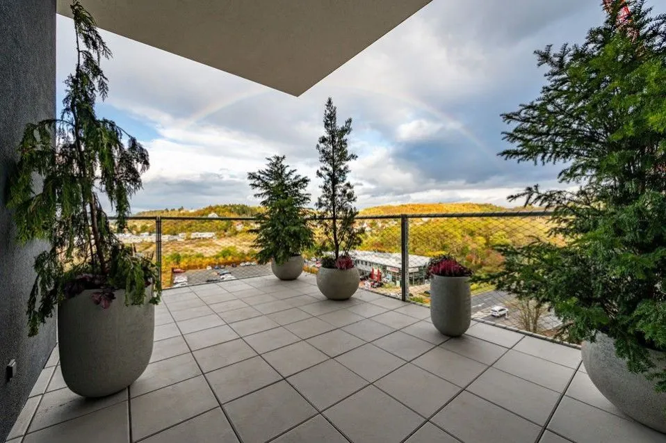 Dispozice bytu 3+kk zahrnuje vstupní část, otevřený, velkorysý prostor obývacího pokoje s kuchyní v šedém designu a jídelnou s přímým vstupem na terasu s posezením a výhledy na Prahu, dále ložnice ve zvýšeném podlaží, koupelna, (vana, sprchový kout), samostatná toaleta, bidet, dostatečné množství úložných prostor.