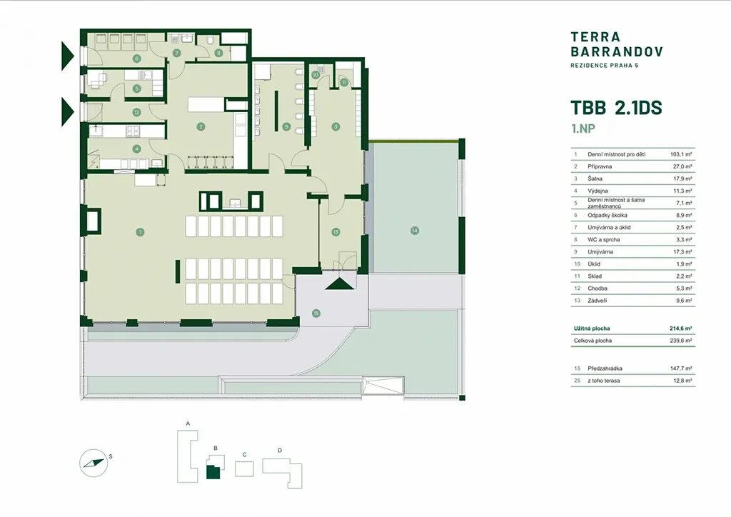 Nabízíme k prodeji prostornou komerční jednotku o užitné ploše 239,6 m2 + předzahrádka 147,7 m2, z toho terasa 12,8 m2 v nově vznikajícím rezidenčním projektu Terra Barrandov na Praze 5. Jednotka se nachází v rozvíjející se lokalitě Barrandova s potenciálem stabilní klientely z řad rezidentů i širokého okolí. Výhodou je také dobrá dopravní dostupnost včetně blízkosti tramvajové zastávky a příroda v blízkém okolí.