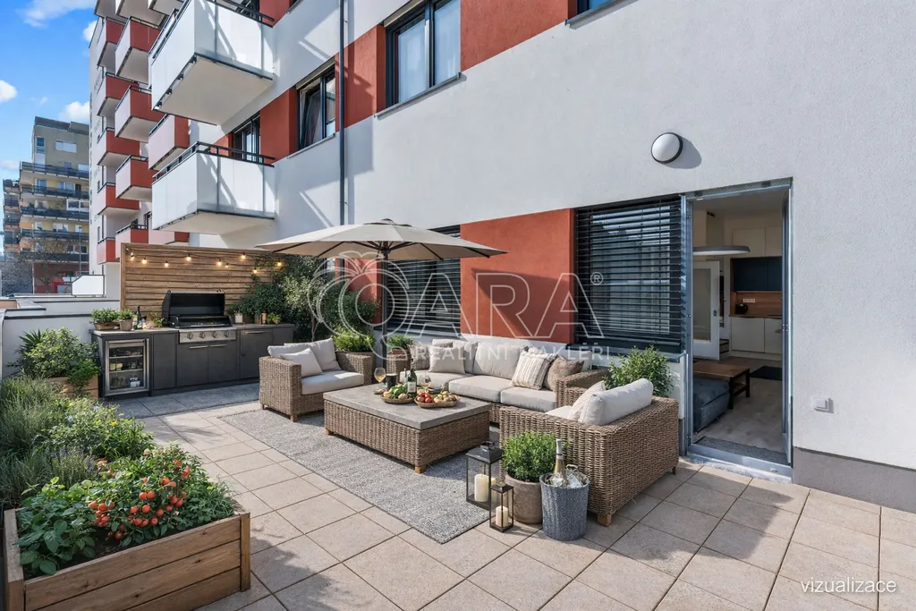 Pronájem zcela nového a vybaveného luxusního bytu o dispozici 3+kk 70 m2 s velkorysou terasou 43 m2 a garážovým parkovacím stáním ve velmi žádané lokalitě Prahy 5 - Hlubočepy.