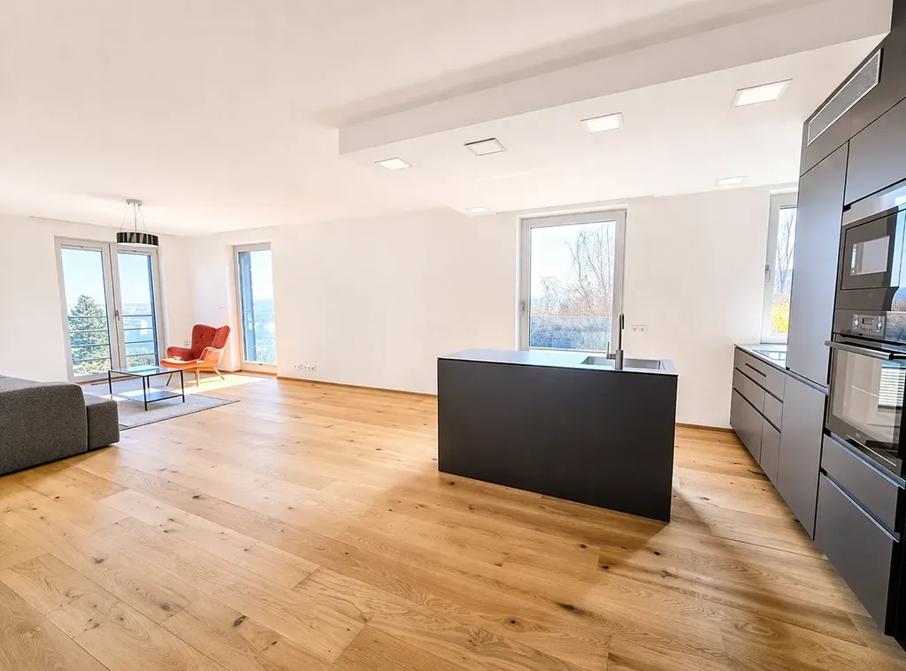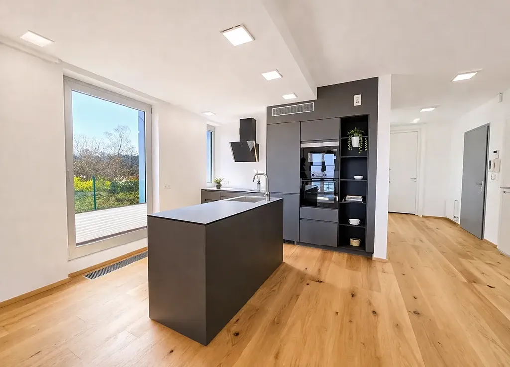 Interiér bytu byl navržen s důrazem na nadčasový design, maximální komfort a použití prvotřídních materiálů. Dominantou obytného prostoru je elegantní kuchyňská linka na míru, vybavená vestavěnými spotřebiči značky AEG – horkovzdušnou troubou, indukční varnou deskou, mikrovlnnou troubou, myčkou nádobí a lednicí s mrazákem. Celý byt je vybaven moderním systémem rekuperace vzduchu, který zajišťuje zdravé a komfortní vnitřní prostředí po celý rok.