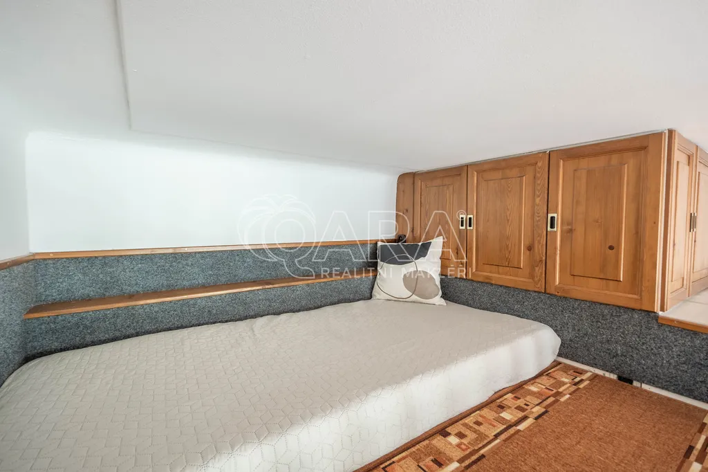 Bytový dům se nachází ve vedlejší méně frekventované ulici a je orientovaný na východ. Je v 1. patře a má 22 m2 + spací patro s úložným prostorem. Je rozdělený na obývací pokoj s kuchyňskou linkou (14 m2), koupelnu s toaletou (2,2 m2), předsíň (5 m2), komoru (0,8m2) a spací patro s úložným prostorem.