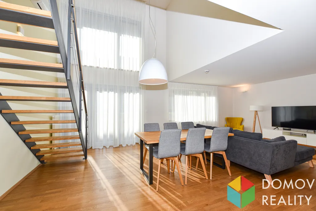Nabízíme k prodeji moderní mezonetový byt s terasou, lodžií a krytým parkovacím stáním. Celková podlahová plocha bytu činí 108,2 m2 včetně sklepa. K bytu dále náleží na jih orientovaná lodžie s výměrou 15,3 m2 přístupná z obývacího pokoje ve 3. NP a na sever orientovaná terasa s výměrou 12,4 m2 ve 4. NP. Součástí prodeje je také kryté parkovací stání. Ve spodním patře bytu se nachází vstupní chodba, koupelna s toaletou, obytný prostor a kuchyně, po schodech se dostanete do patra se dvěma ložnicemi a druhou koupelnou.