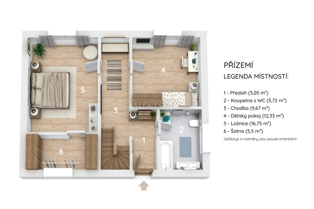 Přízemí: vstupní chodba, dvě místnosti (jedna se šatnou), koupelna