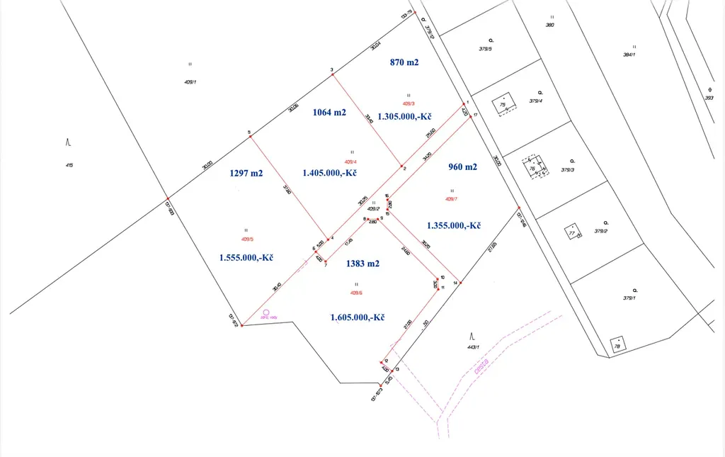 K prodeji je nyní 5 pozemků s různými výměrami: