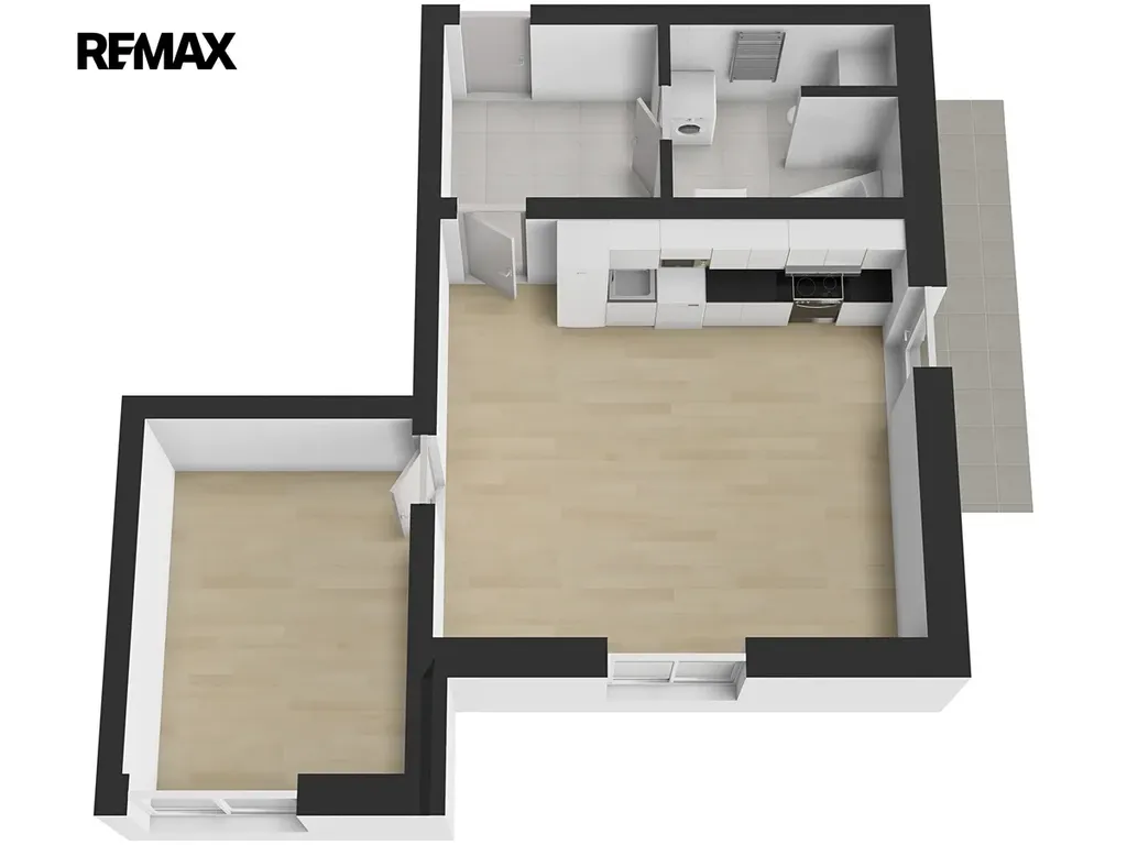 Byt je členěn na obývací pokoj s kuchyní (cca 26,73m²), pokoj (cca 13,80m²), předsíň (cca 5,4m²), koupelnu s toaletou (cca 5,76m²).