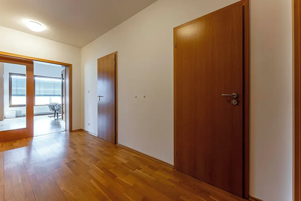 Dále jsou zde 2 ložnice, koupelna s vanou, další koupelna s toaletou pračkou a sušičkou. Ložnice mají vstup na další, již o něco menší terasa s výhledy na Šárecké údolí a Nebušice.