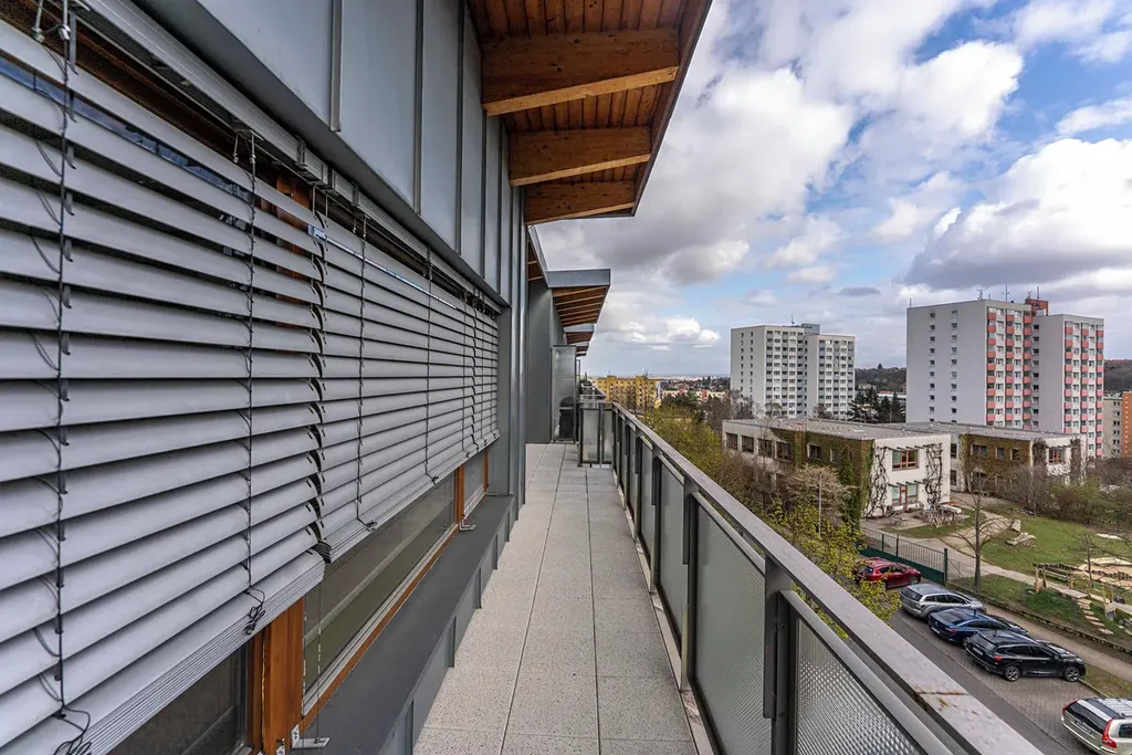Vzdušnému bytu v posledním 4. patře domu má vévodí prostorný a vzdušný obývací pokoj s kuchyní a vstupem na velkou terasu. Pokoj je světlý s jižní orientací, z terasy jsou pěkné výhledy na okolí.