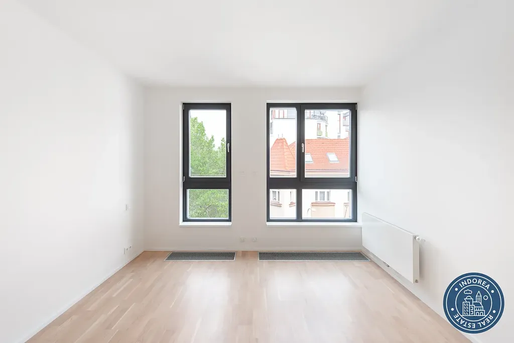 Dominantou je velkorysý obývací prostor o velikosti 42 m² s luxusní kuchyňskou linkou, dřevěnými podlahami a velkoformátovými dřevěnými okny. Jižní orientace zaplavuje interiér přirozeným světlem po celý den a plynule navazuje na příjemnou terasu pro ranní kávu i večerní relax. Jednotka je umístěna na rohu budovy a poskytuje tak rovněž vysokou míru soukromí díky minimálnímu počtu sousedů.