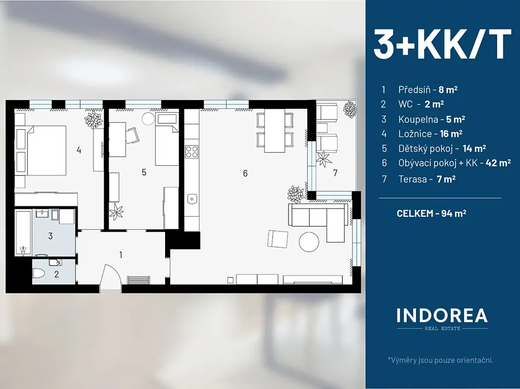 Plocha bytu 87 m2 + terasa 7 m2 + sklep 3,7 m2 + garážové stání 32 m2.