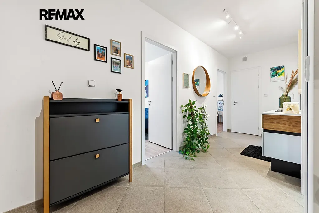 Vybavení zahrnuje vinylové podlahy, dlažbu, bílé stěny, plastová okna, bezpečnostní dveře; teplá voda a vytápění je zajištěno připojením na centrální teplovod; plně vybavenou designovou kuchyňskou linkou, která obsahuje moderní vestavěné spotřebiče (lednici, mrazák, digestoř, mikrovlnnou troubu, varnou desku a myčku nádobí vše od výrobce BOSCH), kuchyňský stůl a židle, rohová pohovka a kávový stolek, velkoplošná LED TV a sound-bar od výrobce LG, rozkladací gauč a psací stůl v pracovně (menším pokoji), manželská postel a noční stolky. Sytém rekuperace vzduchu je v každém pokoji. Z obývacího pokoje máte přístup na slunný balkón, kteřý nabízí místo k relaxaci nebo posezení. V koupelně je keramická dlažba, bílé keramické umyvadlo, obdelníková vana, zrcadlo s podsvícením, pračka BOSCH. Díky velkým oknům je byt plný přirozeného světla a nabízí vzdušný a prostorný interiér. Orientace bytu je na východ, tudíž budete mít dostatek světla. Výhled z oken je na soukromý vnitroblok, kde se v létě dá odpočínou a grilovat. Velkou výhodou je, že před budovou není další zástavba.