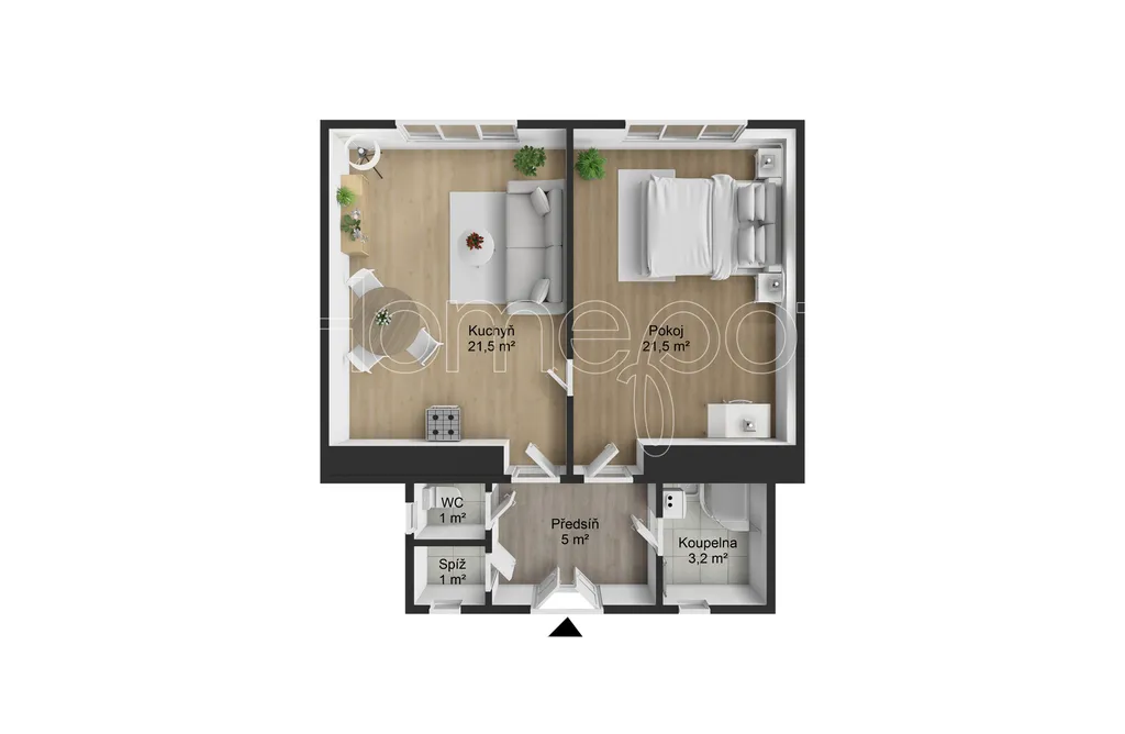 Byt dnes funguje jako 1+1, ale díky velikosti místností nabízí jednoduchou úpravu na dispozici 2+kk. Dispozice tuhle změnu přirozeně umožňuje bez složitých zásahů – přesunutím kuchyně do obytné části vznikne plnohodnotný obývací prostor s kuchyňským koutem a samostatná ložnice, kde zároveň zůstává dostatek prostoru například pro pracovní kout nebo úložné prostory.