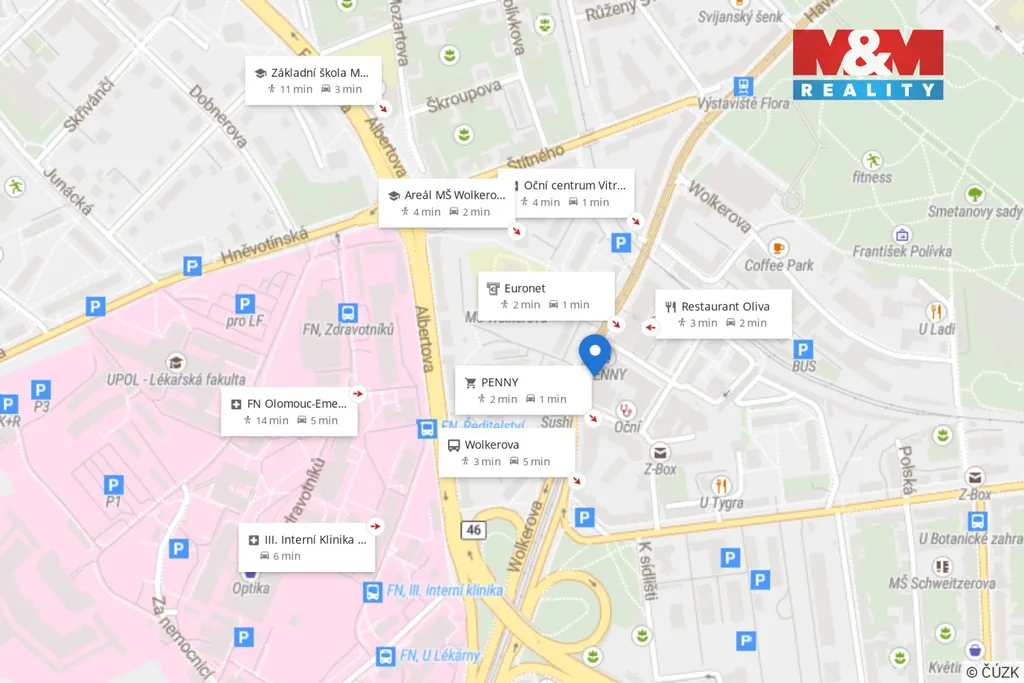 Nabízíme k prodeji byt 1+kk s balkónem na ulici Wolkerova v Olomouci. Byt se nachází v 5.NP a součástí prodeje je garážové stání a samostatná komora na chodbě. Velkou předností bytu jsou kvalitní a nadstandardní prvky jako sádrové omítky, bezfalcové dveře, bezpečnostní vstupní dveře u bytu i komory, klimatizace, teplovodní podlahové topení ovládané termostatem, venkovní elektrické žaluzie a značkové zařizovací předměty v koupelně. Byt se prodává kompletně zařízený dle fotek. Nemovitost je také skvělou investiční příležitostí díky velmi nízkým nákladům na bydlení. Jedná se o velmi atraktivní lokalitu. Poloha domu spojuje vynikající dopravní dostupnost a občanskou vybavenost, bezprostřední blízkost hromadné dopravy a sousedství městských parků. Do centra města jen dvě zastávky tramvají, k radnici 10 minut pěšky. V případě zájmu o prohlídku, kontaktujte makléřku. Zajistíme nejvýhodnější financování nemovitosti.