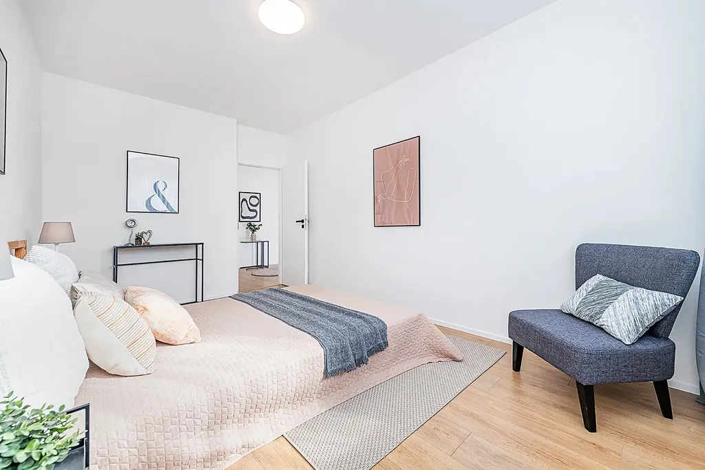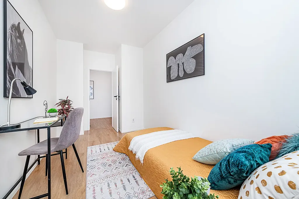 Dispozici bytu tvoří tři neprůchozí ložnice, velkorysý obývací pokoj spojený s kuchyní, prostorná koupelna se sprchovým koutem a samostatný záchod.