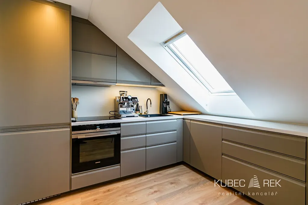 K dispozici je kuchyňská linka s elektrickou troubou, indukční varnou deskou, lednicí, myčkou nádobí a digestoří. Dále byt disponuje pračkou se sušičkou, jídelním stolem se židlemi, gaučem a matrací na spaní.