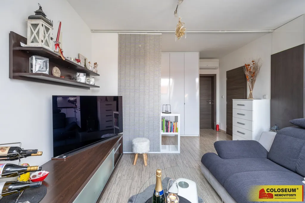 Dispozice bytu je velmi praktická – obývací část je propojena s kuchyňským koutem, což vytváří vzdušný a příjemný prostor pro každodenní život. Kuchyňská linka je stará pouhé 4 roky a nabízí dostatek pracovního i úložného prostoru, samozřejmostí jsou spotřebiče i místo pro jídelní stůl.