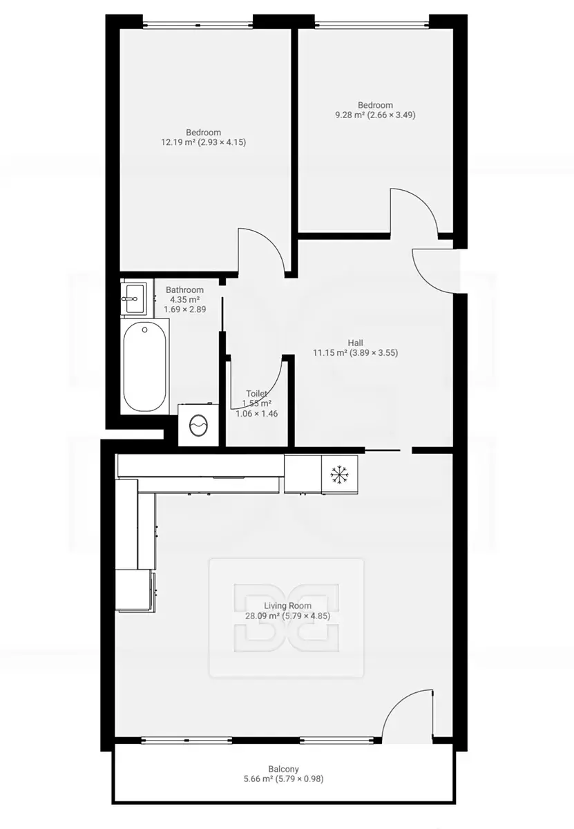 Byt disponuje prostorným obývacím pokojem s moderním kuchyňským koutem a vstupem na balkon. Kuchyňská linka zahrnuje lednici, myčku nádobí, horkovzdušnou troubu, mikrovlnou troubu, indukční desku, digestoř a spoustu pracovního a úložného prostoru. Byt nabízí 2 samostatné ložnice. Koupelna je vybavena vanou a pračkou. Toaleta je oddělená. Na patře naproti bytu se nachází úložný prostor. Dále je možné využít kočárkárnu v přízemí domu.