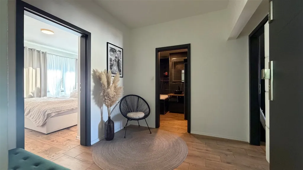 Byt tvoří prostorná předsíň, obývací část s kuchyňským a jídelním koutem, ložnice s praktickou šatnou, kde najdeme na zakázku vyrobenou vestavěnou skříň, dále další pokoj a koupelna s toaletou. Součástí prodeje je moderní kuchyňská linka s vestavěnými spotřebiči. Ohřev vody a vytápění bytu je řešeno úsporným plynovým kondenzačním kotlem. K bytu náleží sklep o výměře 6 m2 a půdní kóje.
