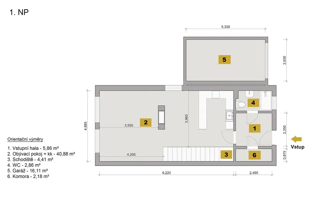 Dominantou přízemí je prostorný obývací pokoj s kuchyňským koutem (40,88 m²), který tvoří srdce celého domu. Přímý vstup na zahradu přirozeně propojuje interiér s exteriérem a vytváří ideální prostor pro každodenní život i relaxaci.
