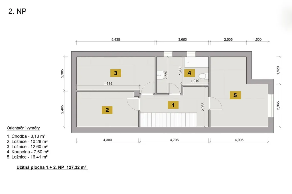 V patře se nachází tři samostatné pokoje, které lze využít jako ložnici a dětské pokoje či pracovnu, dále prostorná koupelna a chodba s úložnými možnostmi. Bonusem je také půdní prostor, který nabízí další úložné kapacity.