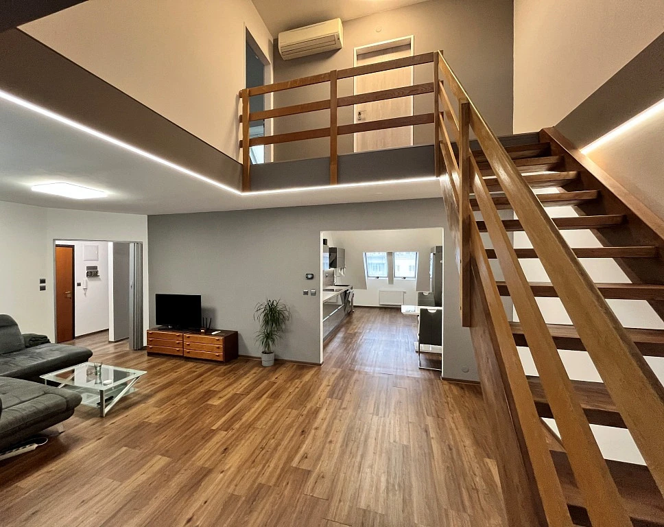 Byt je situován v 6.NP (5. patro) bytového domu s výtahem. Přízemní část bytu disponuje velkým obývacím pokojem, velkou kuchyní, jedním neprůchozím pokojem (15,97 m²) a jedním menším pokojem (9,49 m²). Další dva samostatné pokoje (20 m² a 10m²) naleznete v patře tohoto mezonetového bytu, které je spojeno schodištěm z modřínového dřeva.