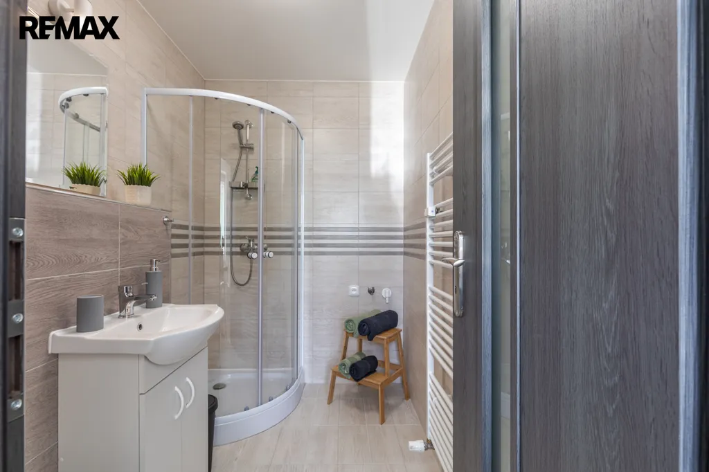 Byt zajišťuje nájemcům komfortní bydlení v příjemném novém interieru s novým vybavením: kuchyňská linka v praktickém rovném tvaru s volně stojíícm plynovým sporákem, digestoří, volně stojící MW troubou, v pokoji šatní skříň, pohodlné dvojlůžko, odkládací stolky, TV stolek s televizí, komoda, sedačka v šedé barvě, béžová koupelna se sprchovým koutem pro pohodlnou koupel, umývadlová skrříňka pro ukládání toaletních potřeb, na oknech žaluzie, podlahy - v pokoji plocoucí, v kuchyni a v předsíni dlažba. Vše zánovní, čisťoučké, voňavé, ihned k nastěhování. Součástí pronájmu je sklepní kóje hned za bytem.