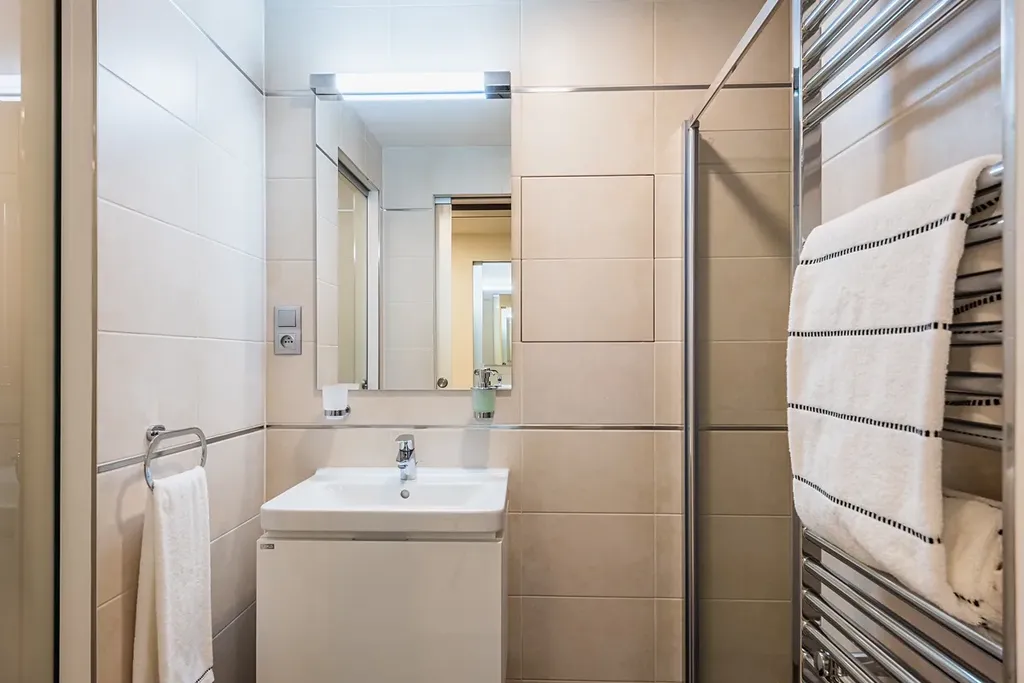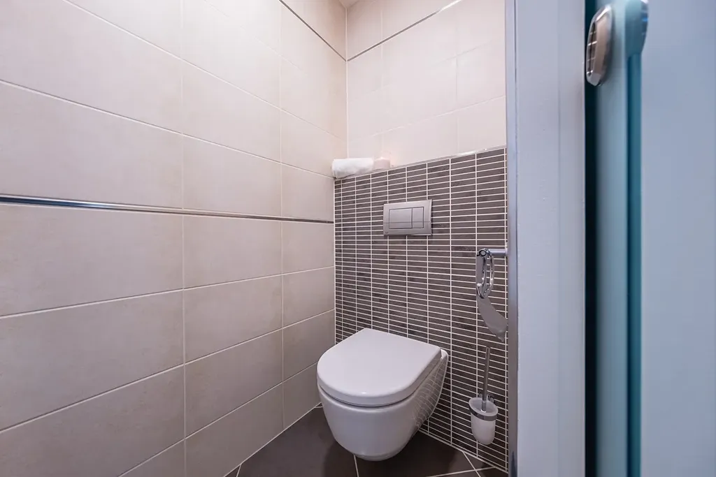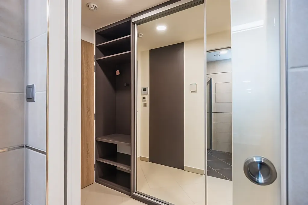 Byt má šikovné dispoziční řešení a dostatek úložných prostor, veškerý nábytek je vyroben na míru. V předsíni se nachází prostorná vestavěná skříň s botníkem a také pračka kombinovaná se sušičkou. Z obývacího pokoje je přístup na prostorný balkon s výhledem do klidné ulice. Kuchyňská linka je vybavena všemi spotřebiči včetně lednice, myčky a kombinované trouby s mikrovlnným ohřevem. Jídelní stůl a židle jsou spojeny s obývacím pokojem, kde je připravena pohodlná rozkládací pohovka. V bytě je samostatné WC a koupelna se sprchovým koutem.